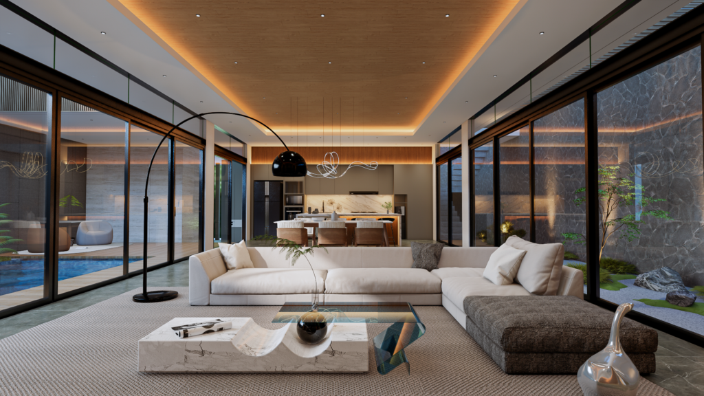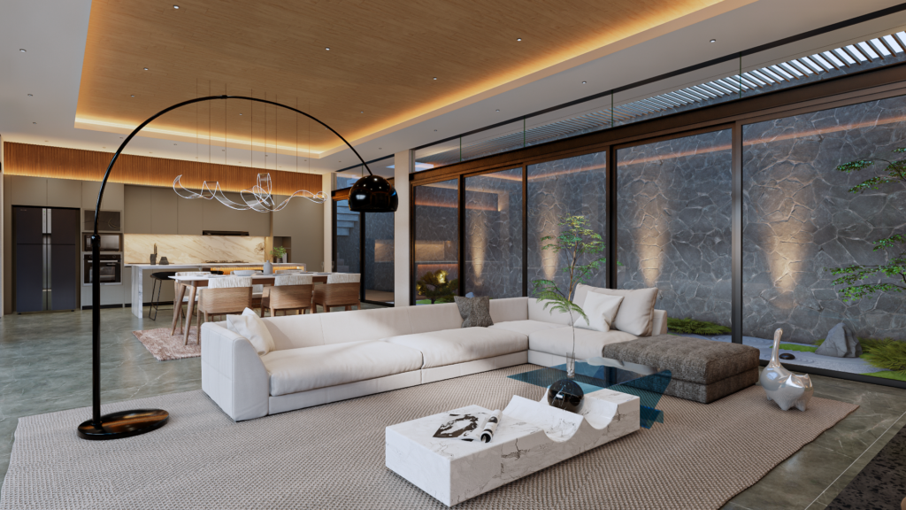 Untuk menciptakan kesan luas, rumah ini menerapkan konsep open space yang menggabungkan ruang dapur, ruang makan, dan ruang keluarga dalam satu area besar tanpa sekat permanen. Penggunaan jendela besar dan pintu kaca geser memungkinkan cahaya alami masuk secara optimal, memberikan kesan lebih lapang dan seamless antara interior dan eksterior.