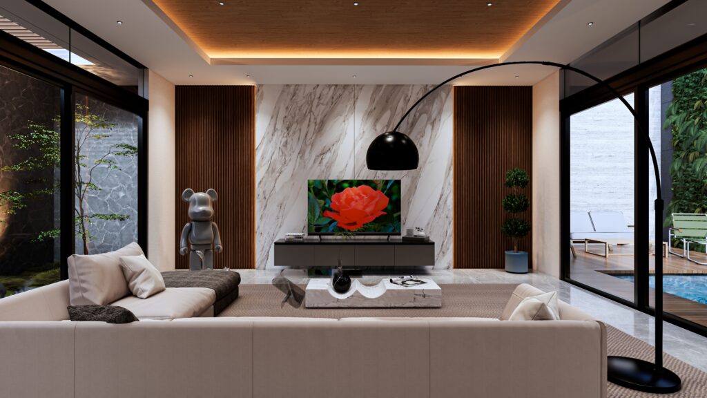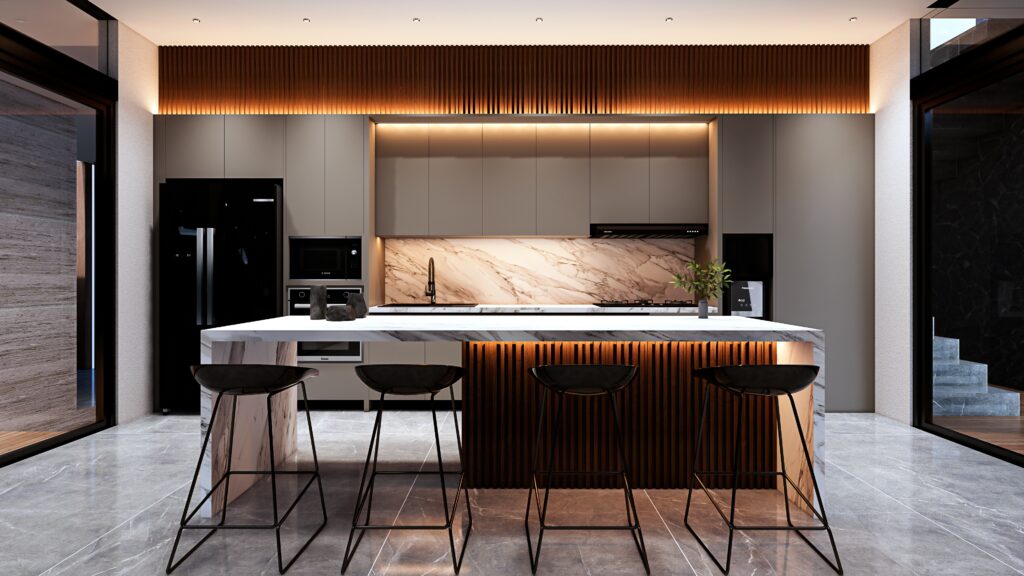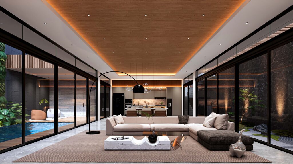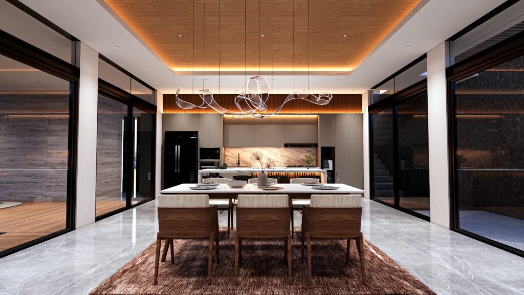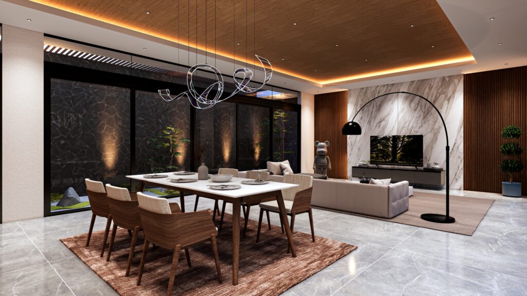 Desain Interior Living, Dining, Kitchen. Menerapkan gaya Arsitektur Natural Kontemporer yang mengusung konsep desain yang menggabungkan esensi hijau, subur, dan kemurahan hati alam.