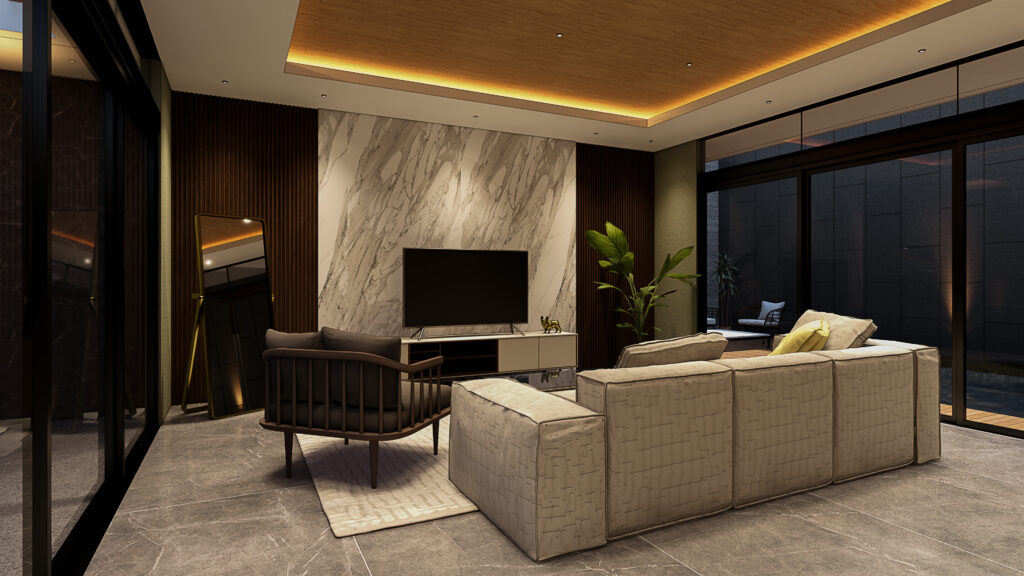 Desain ini banyak mengimplementasikan elemen natural pada interior dan furnitur, seperti lantai concrete tile dan kursi kayu. Color palette yang dipakai netral, dengan tambahan warna emas dari material kuningan.