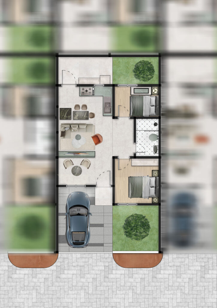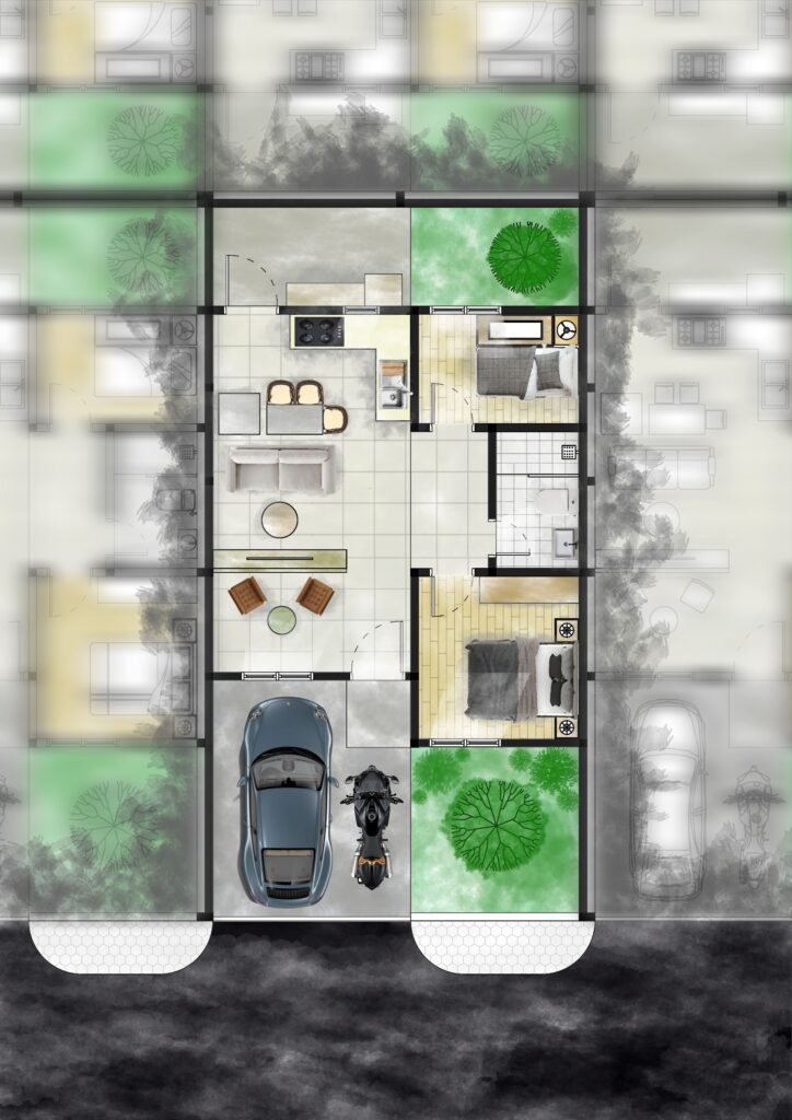 Hasil dari rendering denah untuk denah resindensial menggunakan photoshopÂ