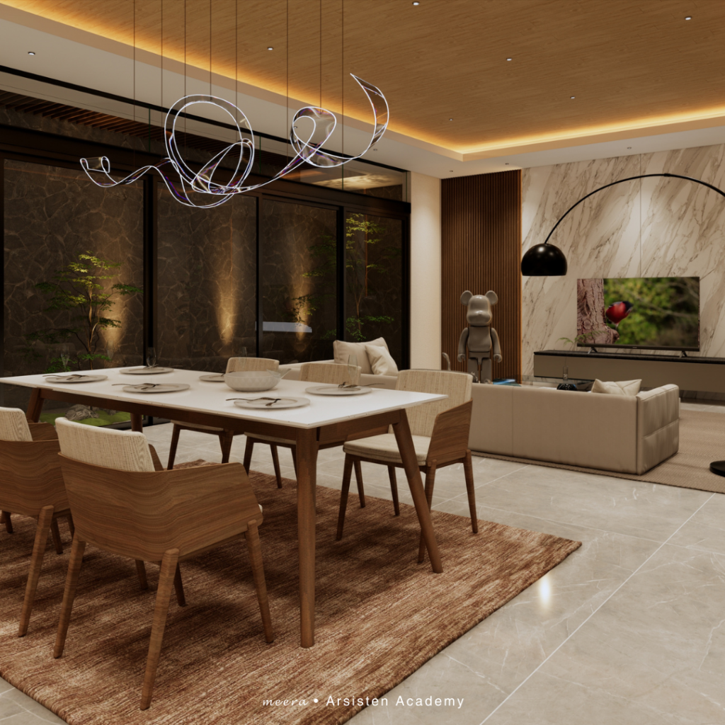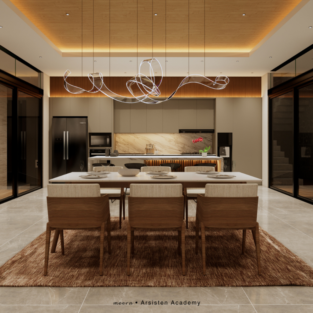Desain Interior Ruang Makan dengan konsep modern kontemporer. Tone warna bernuansa krem dan coklat menghadirkan ambience yang hangat dan tenang. Pemilihan material finish pada kursi menggunakan kayu yang di kombinasikan dengan material fabric pada bagian busa. Kemudian meja dari marmer terang menjadi kombinasi yang tepat untuk ruang makan.