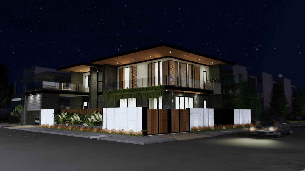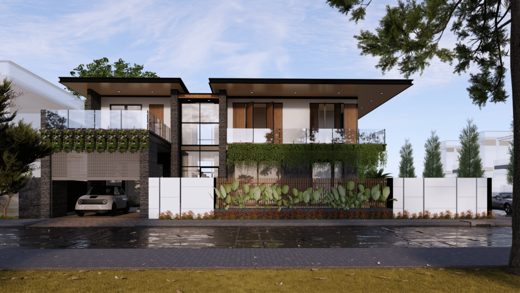 Desain Eksterior Rumah Lantai 2 yang menerapkan gaya Arsitektur Kontemporer yang mencerminkan tren desain terkini dan lebih fleksibel dan inovatif dibandingkan gaya arsitektur lainnya