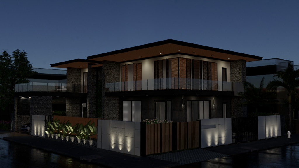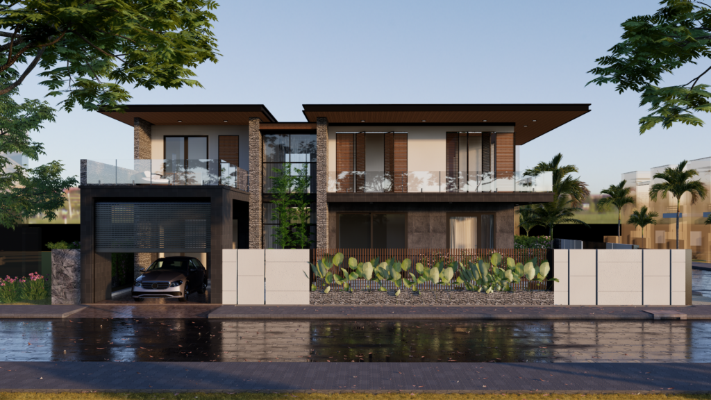 Bangunan pada gambar di atas merupakan sebuah rumah modern minimalis dengan dua lantai. Desainnya menonjolkan elemen kaca, kayu, dan batu alam yang memberikan kesan elegan dan natural. Fasad rumah menggunakan jendela besar untuk memaksimalkan pencahayaan alami, dilengkapi balkon dengan pagar kaca transparan. Garasi tertutup di lantai dasar memberikan kenyamanan bagi penghuni. Taman kecil di depan dengan tanaman hias menambah kesan asri, sementara atap datar memberikan karakteristik khas arsitektur modern.