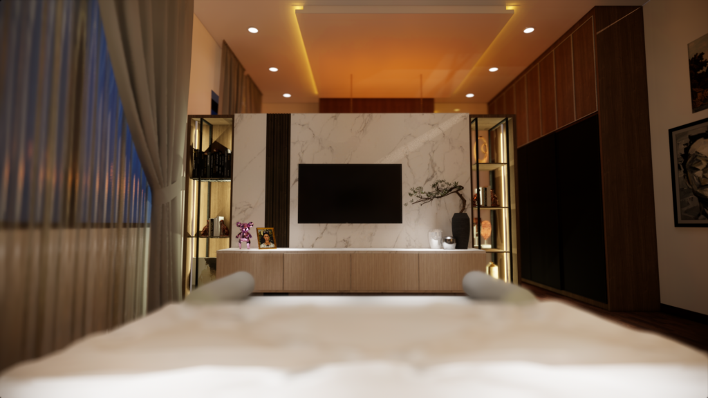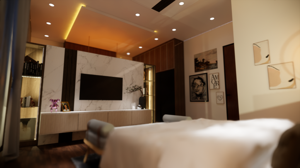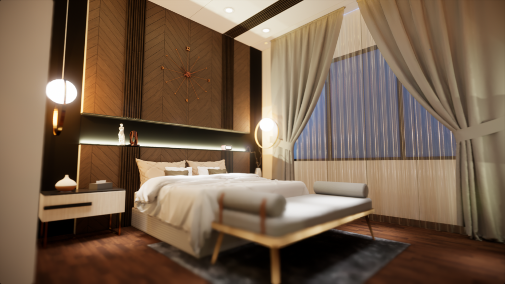desain interior ruangan kamar tidur 4,5m x 5m menerapkan gaya arsitektur luxury yang berarti kemewahan, menonjolkan visual yang berkesan elegan dengan memadukan berbagai macam material elegan berupa partisi kayu maupun furnitur kaca transparan