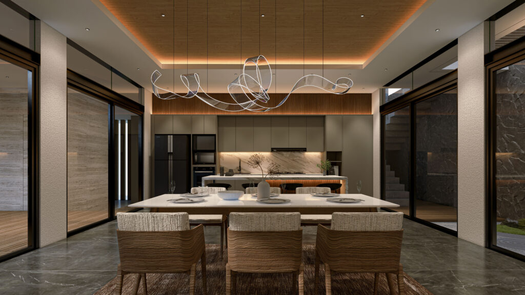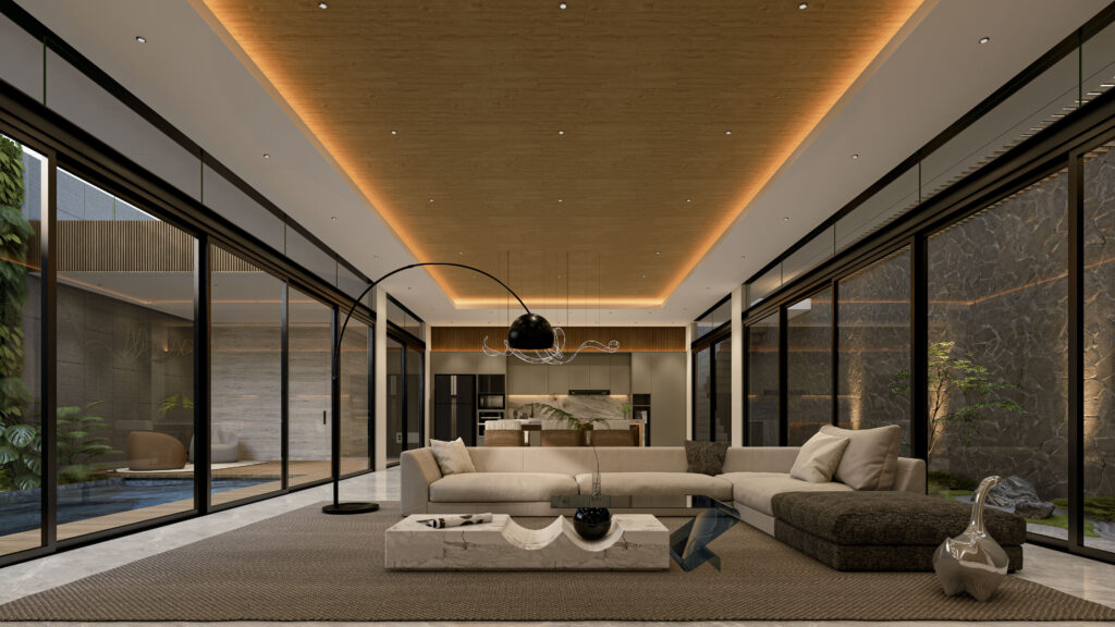 Desain rumah ini mengusung gaya modern minimalis dengan nuansa mewah dan alami. Dominasi material kaca, kayu, dan batu menciptakan kesan ruang yang luas dan harmonis dengan alam sekitar. Pencahayaan hangat dari lampu tersembunyi pada plafon menambah kenyamanan. Penggunaan dinding kaca besar menghubungkan ruang dalam dengan taman luar, menciptakan suasana terbuka yang menenangkan.