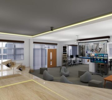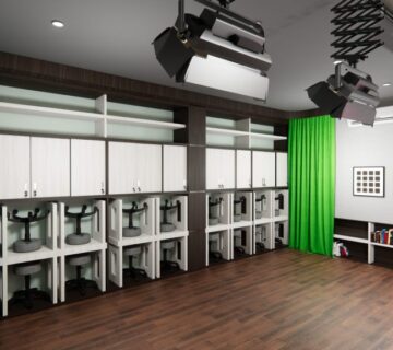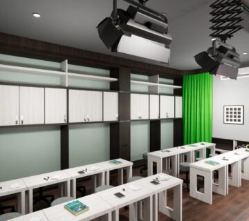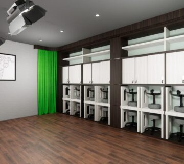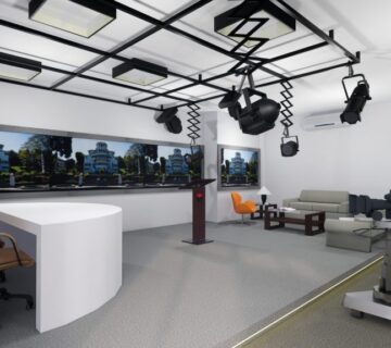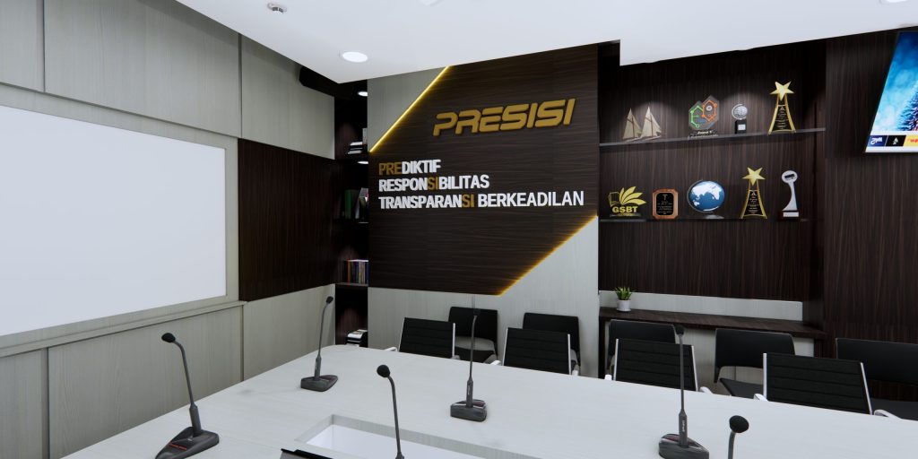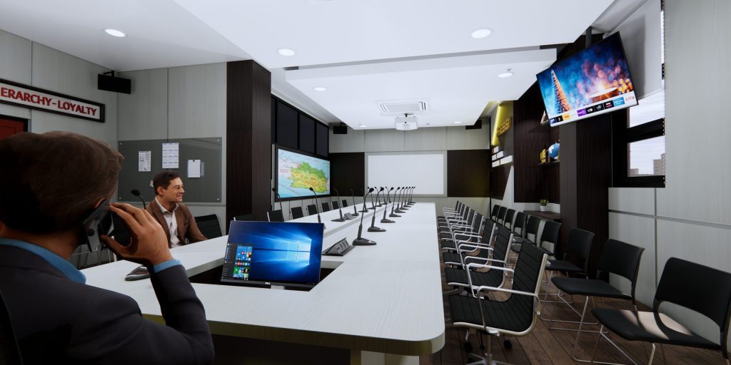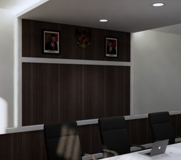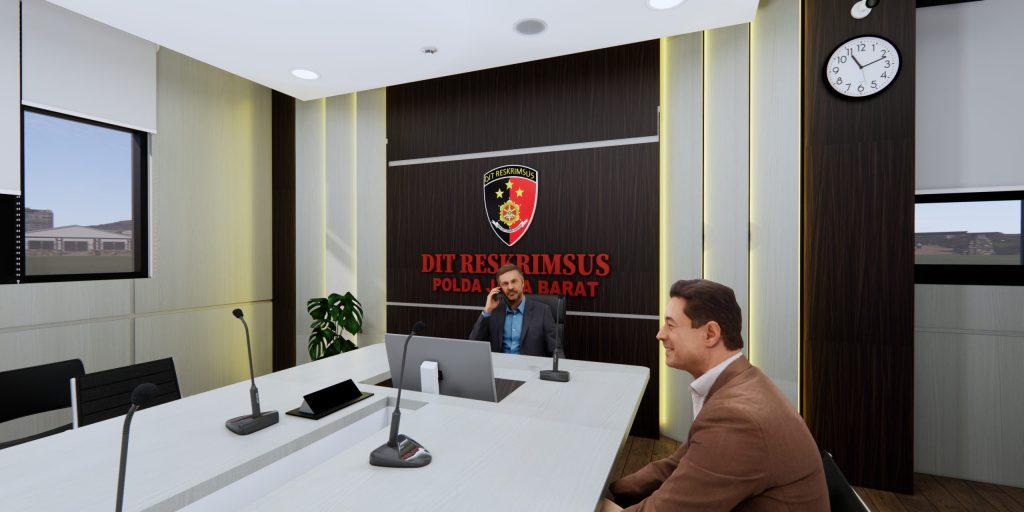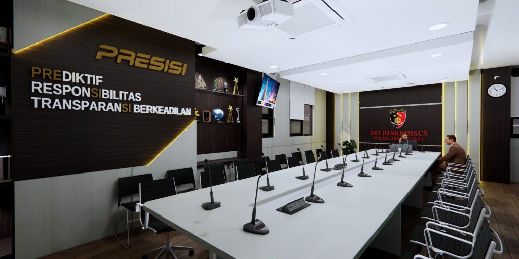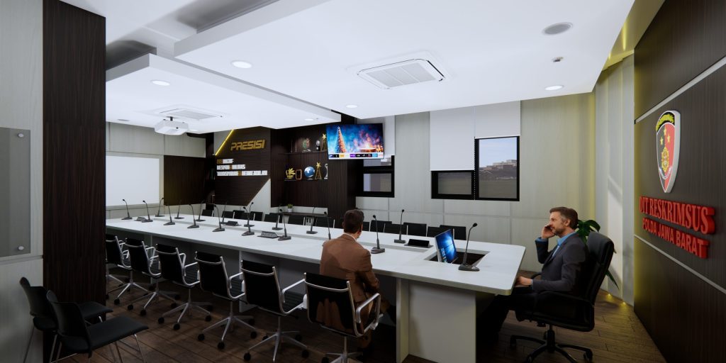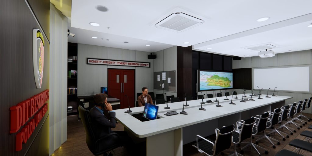 Dengan monitor didepan pemimpin rapat agar bisa melihat tanpa lebih jelasnya tanpa harus kedepan dan juga dilengkapi dengan hambalan-hambalan memanfaatkan sudut ruangan dan aksen serta desain sesuai dengan instansi kepolisian.
