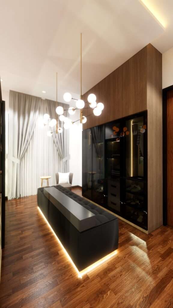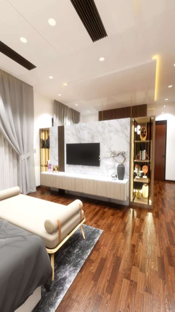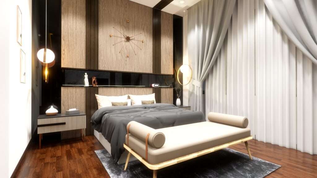 Sebuah desain kamar tidur yang minimalis dan modern. Memiliki banyak fasilitas yang didalamnya, yang bertujuan untuk memanjakan pengguna ruang tersebut.