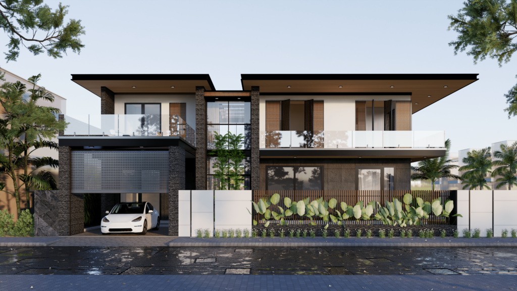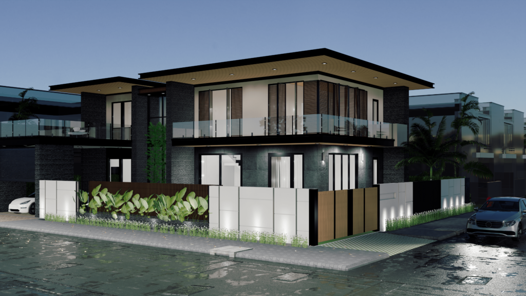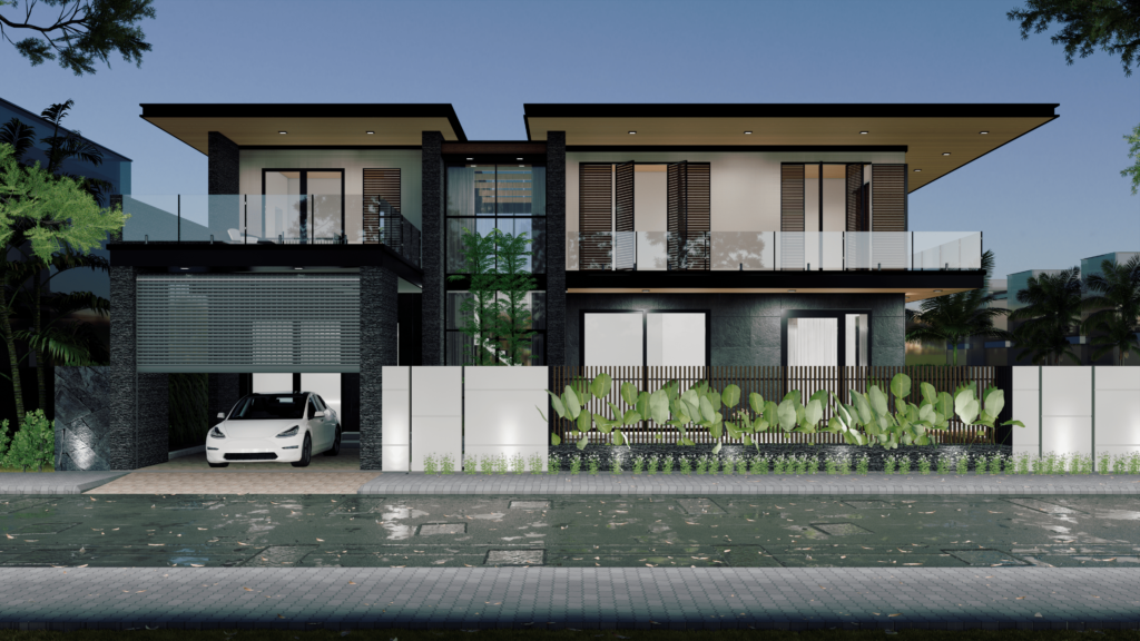 Hasil render rumah bergaya modern dengan output render view pada saat siang hari, malam hari, dan menggunakan warm light