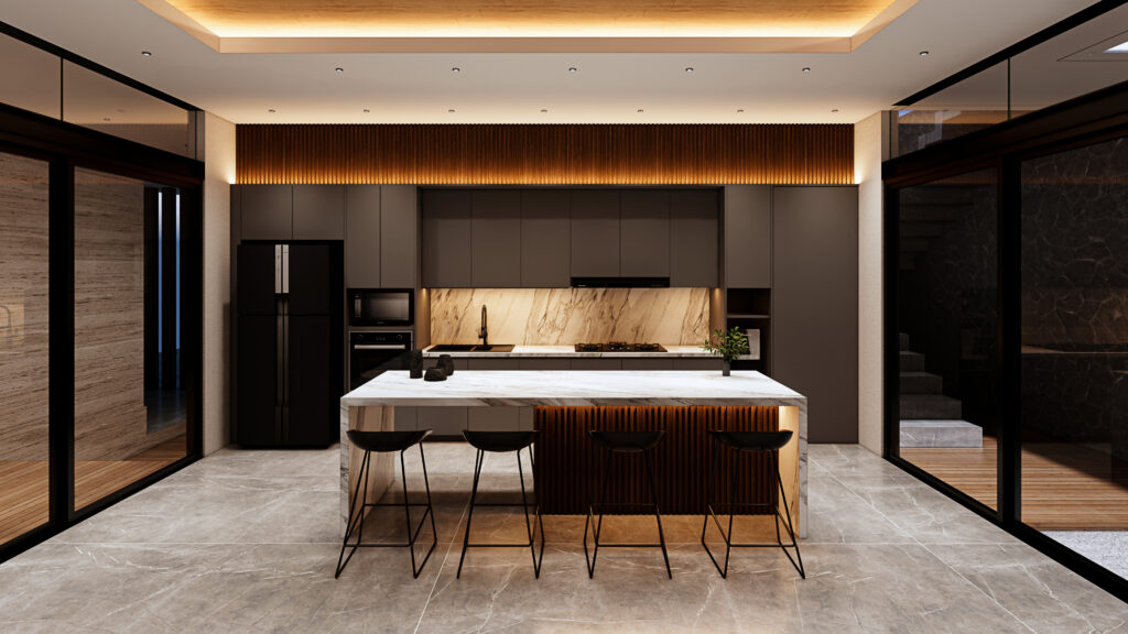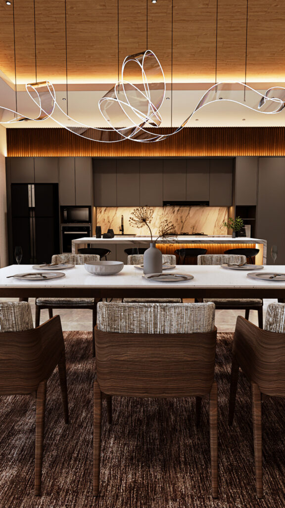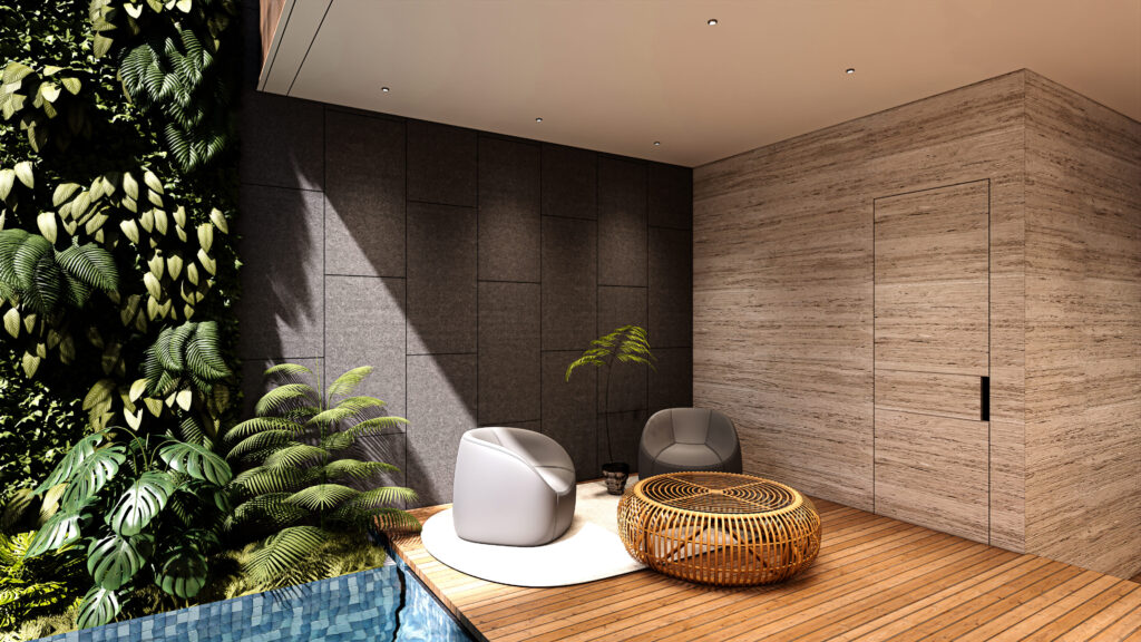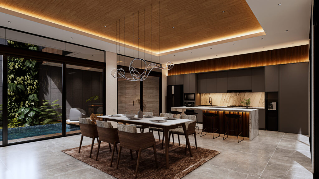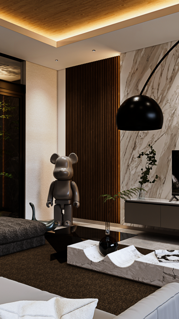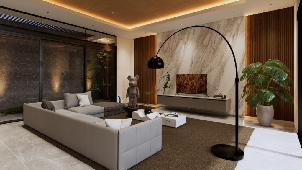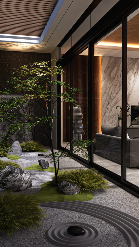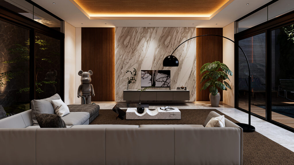 Konsep equanimity menggabungkan elemen-elemen dari gaya japandi dan modern untuk menciptakan ruang yang tenang, seimbang, dan nyaman. Material alami seperti kayu, bambu, dan batu digunakan untuk menciptakan suasana yang hangat dan harmonis dengan alam. Palet warna netral seperti putih, abu-abu, coklat, dan beige mendominasi dengan sentuhan warna hangat dari kayu alami dan aksen warna lembut untuk menciptakan ketenangan
