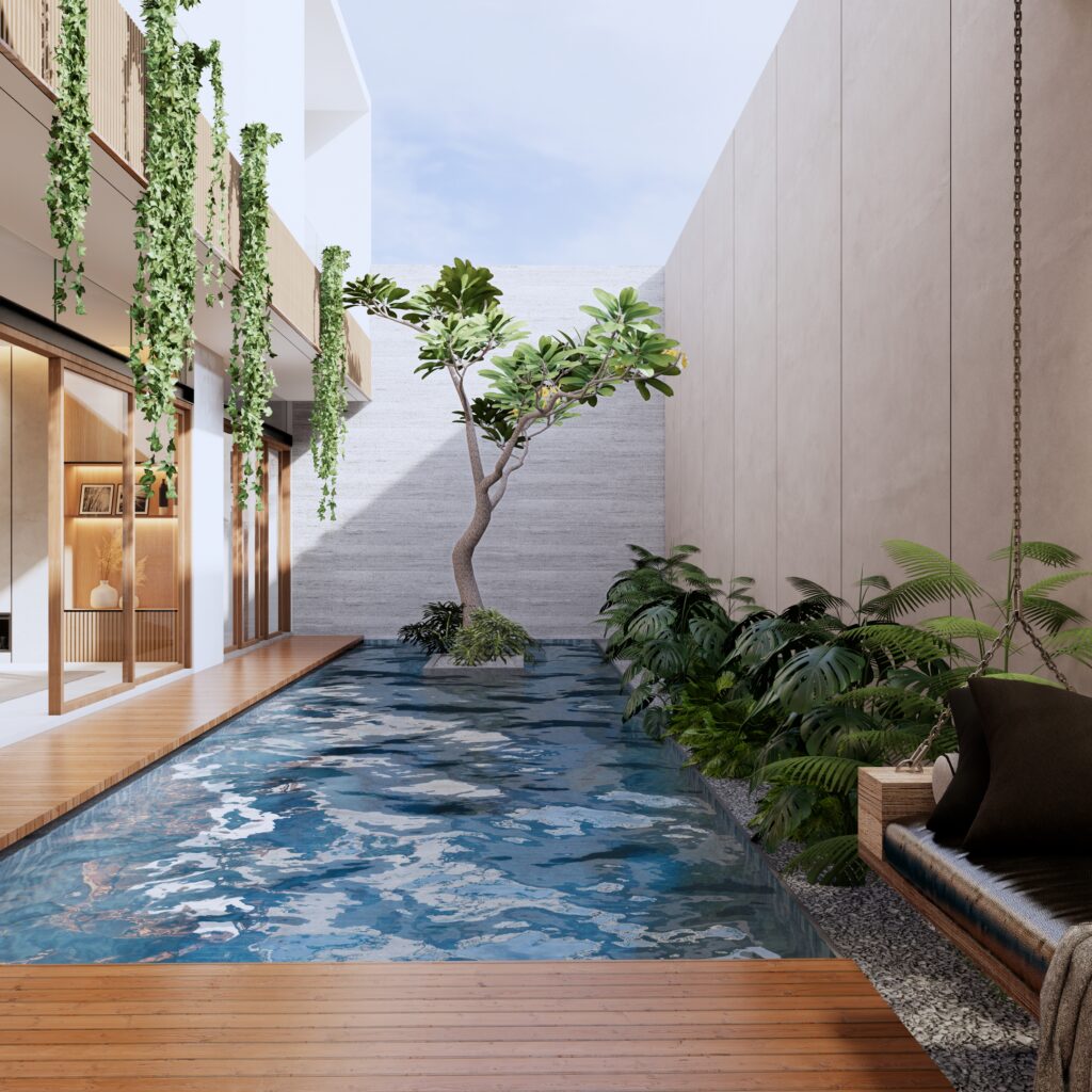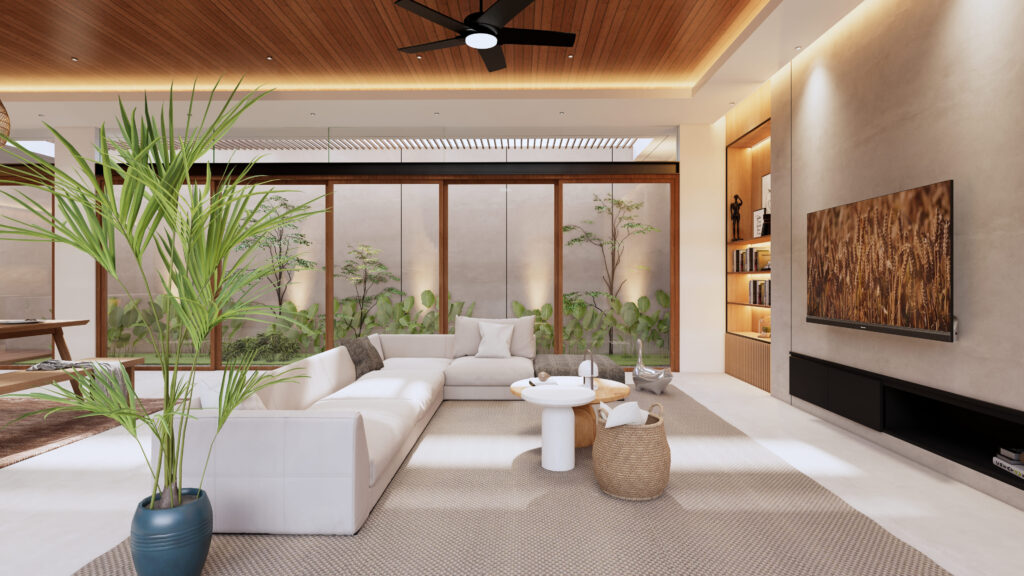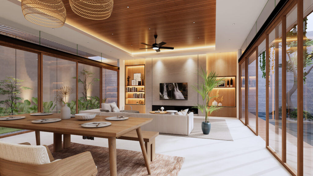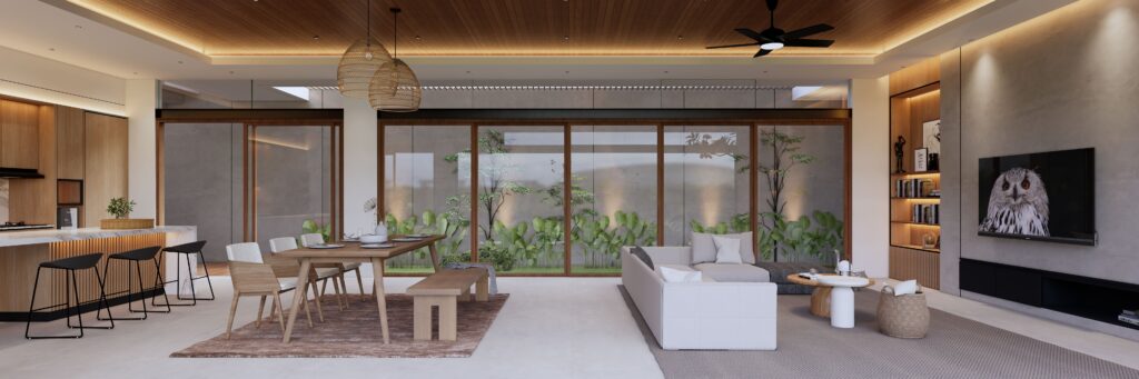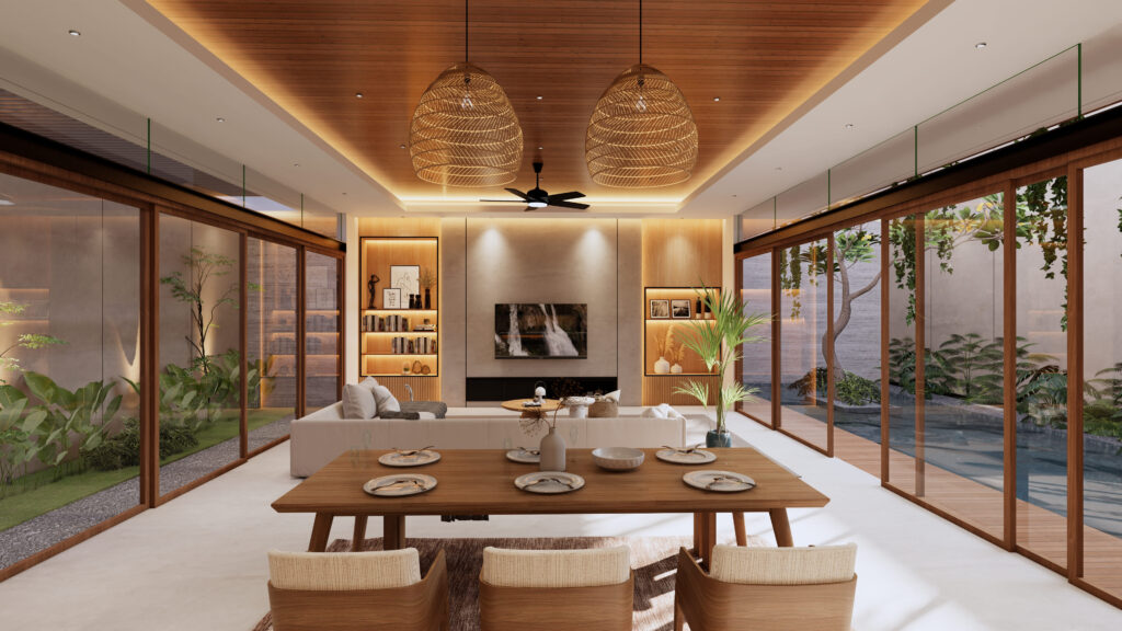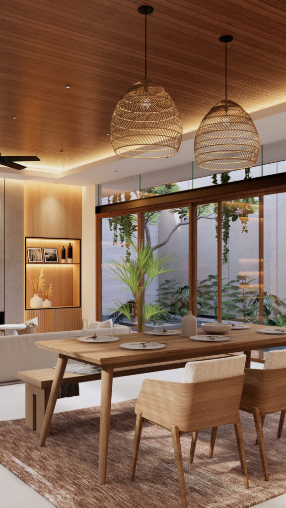 Hunian yang tidak hanya sebagai tempat beristirahat, namun juga sebagai tempat berlibur. Penghuni dapat mendapatkan sensasi beristirahat, bersantai, sekaligus berlibur di rumah yang diitengrasikan element visual yang biasa ditemui ketika berlibur. Dengan tetap berbalut konsep modern living, penggunaan anyaman, serat bambu, kayu, kolam renang, dst menjadi element pelengkap dalam menciptakan konsep Interior Design yang Modern sekaligus Natural.fsd