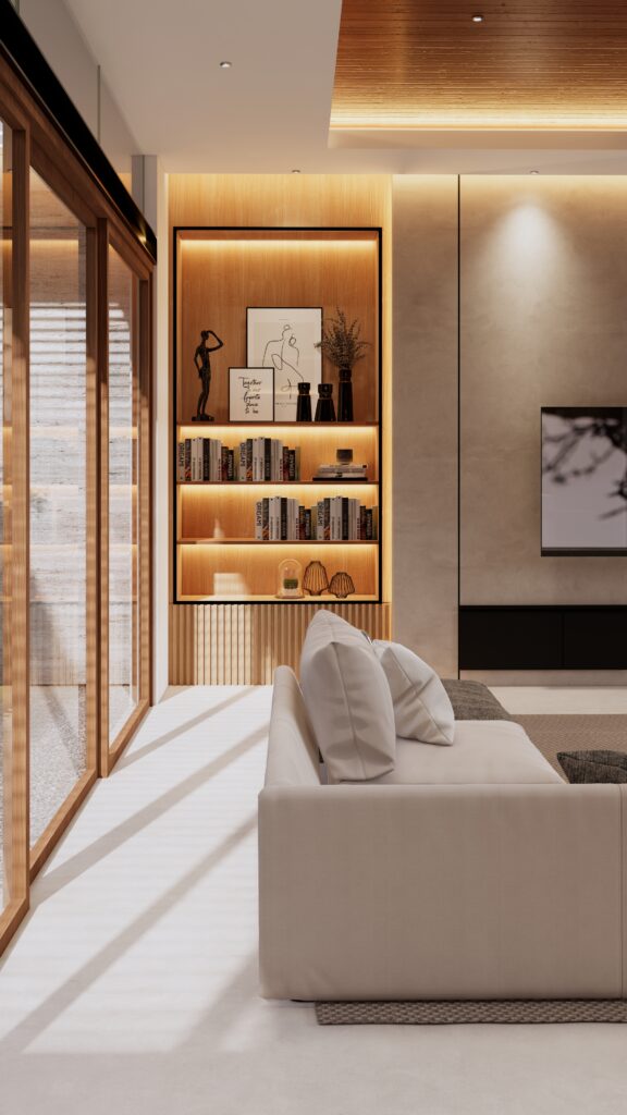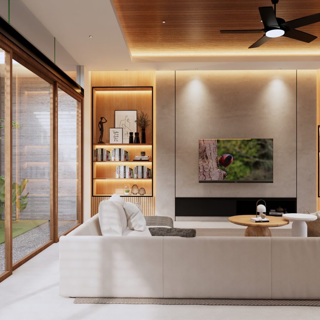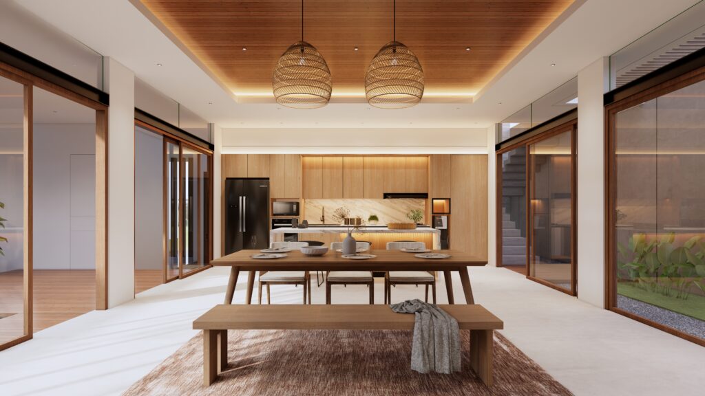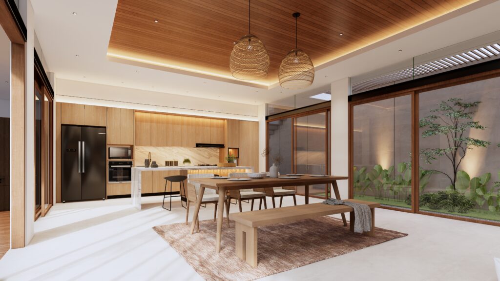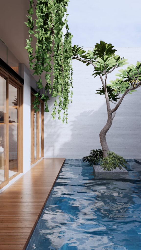Hunian yang tidak hanya sebagai tempat beristirahat, namun juga sebagai tempat berlibur. Penghuni dapat mendapatkan sensasi beristirahat, bersantai, sekaligus berlibur di rumah yang diitengrasikan element visual yang biasa ditemui ketika berlibur. Dengan tetap berbalut konsep modern living, penggunaan anyaman, serat bambu, kayu, kolam renang, dst menjadi element pelengkap dalam menciptakan konsep Interior Design yang Modern sekaligus Natural.fsd