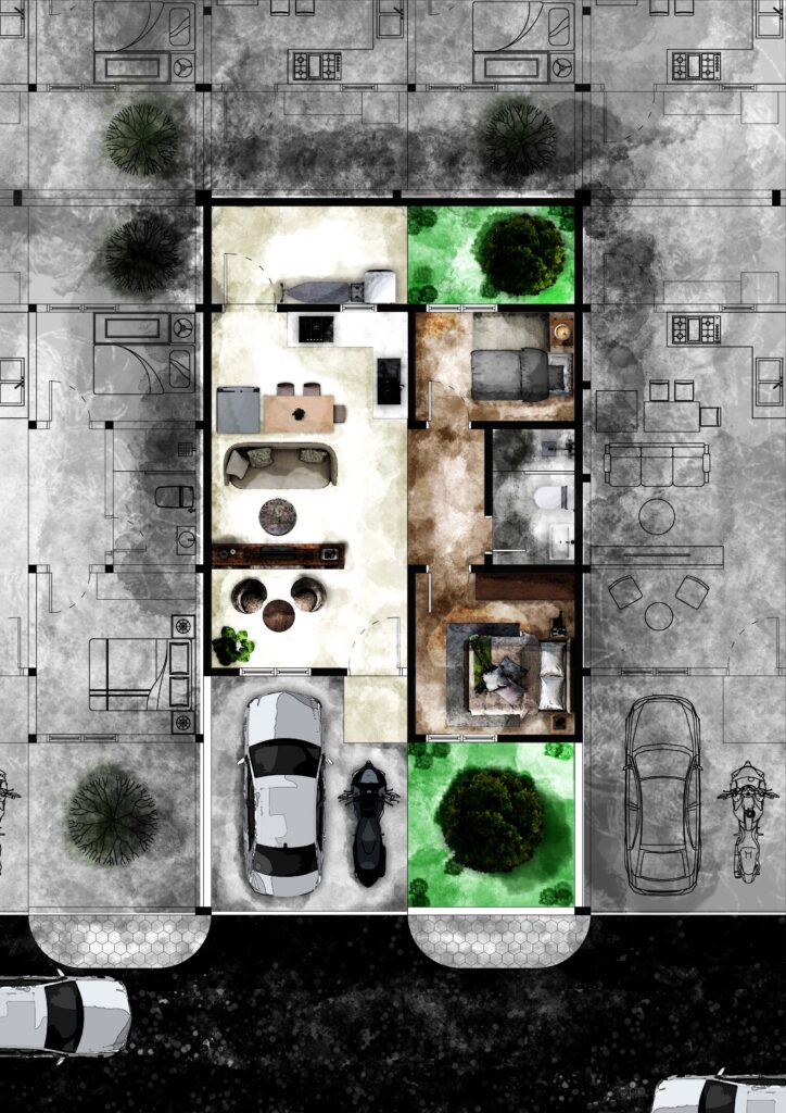 Floor Plan Render dengan watercolor style memberikan visual yang berbeda pada setiap detail desain interior pada rumah ini.