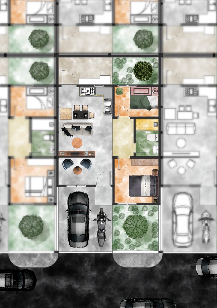 Hasil desain dari Floor Plan Render menggunakan Photoshop dengan base watercolour memberikan kesan visual yang berbeda di setiap detail dari desain interior yang ada pada bangunan rumah ini.