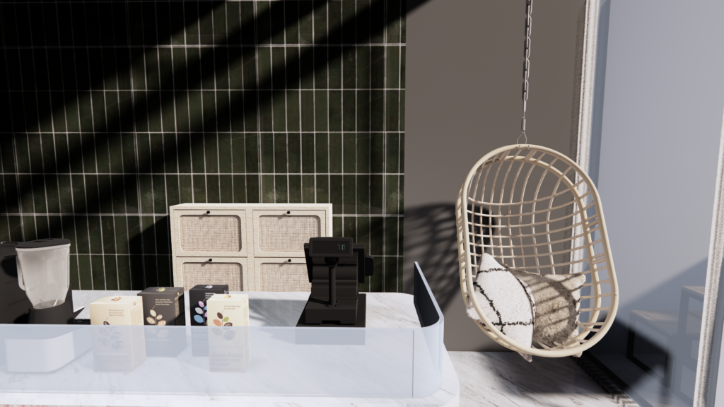 A café with a tropical ambiance, simply designed with a little touch of green and coral color with natural materials furniture like woods and rattan.