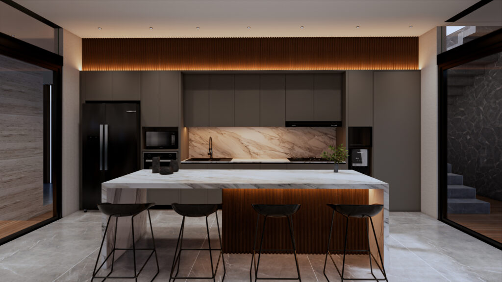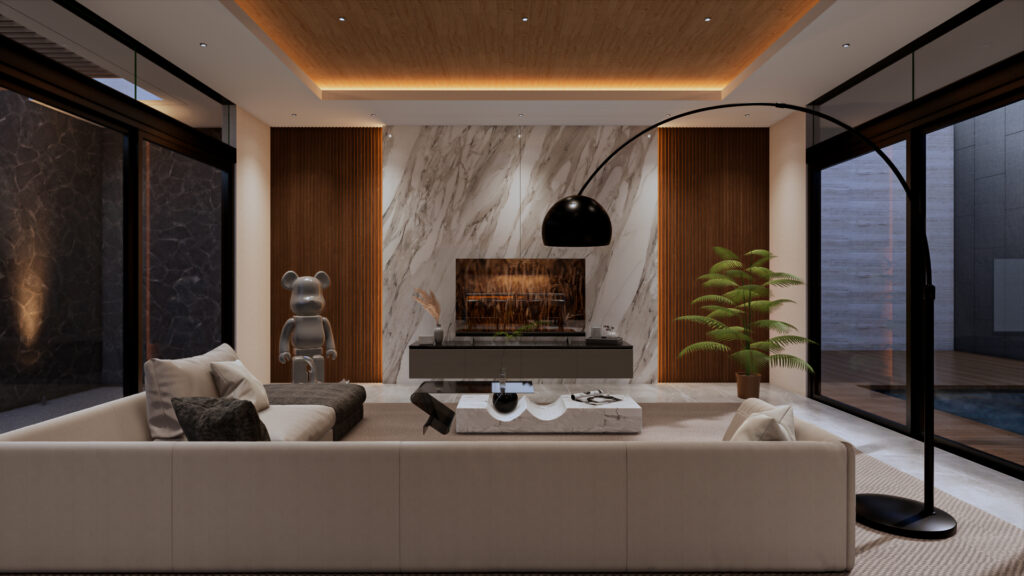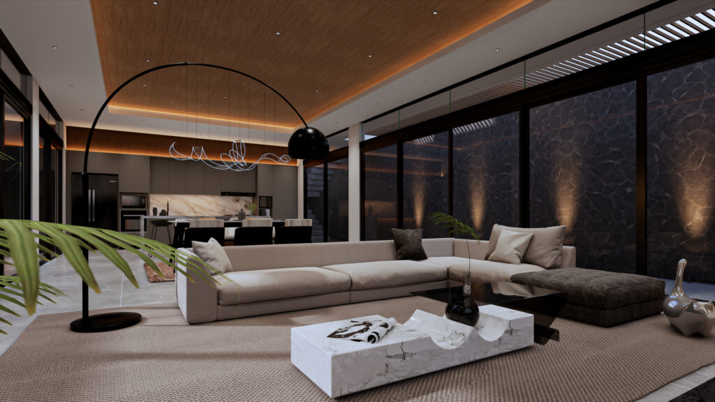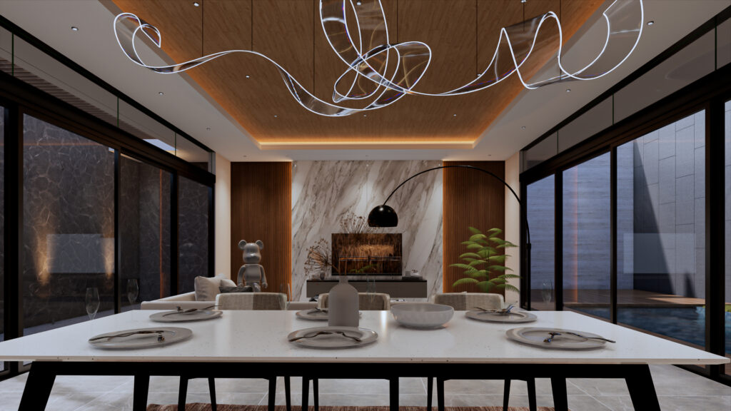 Design Interior yang bertema modern pada penerapan Living, Dining, and Kitchen yang memberi kenyamanan pada pengguna, serta penerapan open space dan penggunaan kaca yang meberi kesan luas pada ruangan.