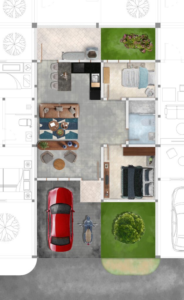 Layout plan in both texture style and watercolor style.