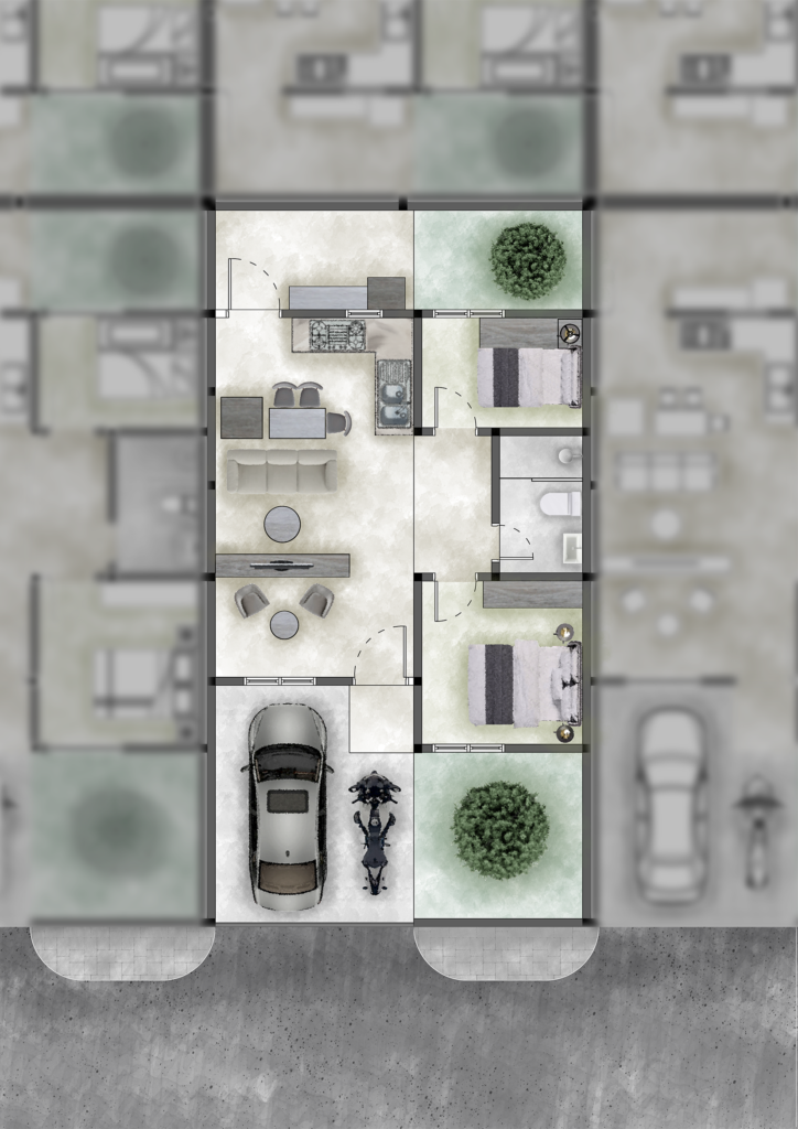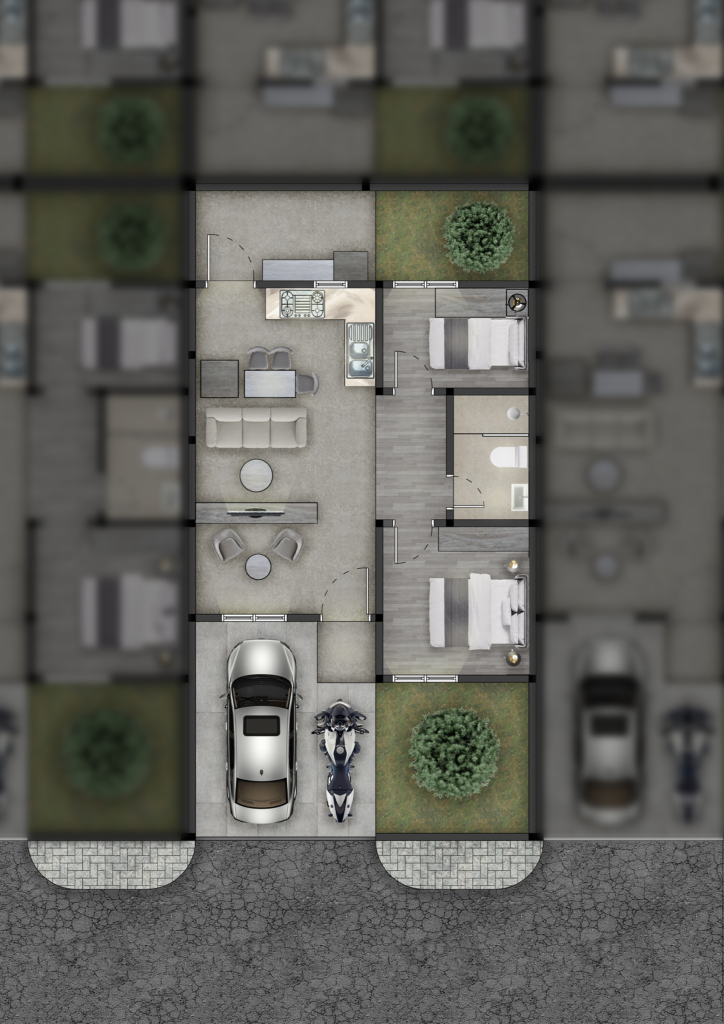 This layout follows a simple and communicative design principle. Texture and color are applied only to the main floor plan to maintain clarity and focus. Surrounding areas like roads are kept minimal, with no added elements such as vehicles, pedestrians, or animals, to avoid visual distractions. This approach ensures the main layout remains the clear focal point and is easy to understand.Â