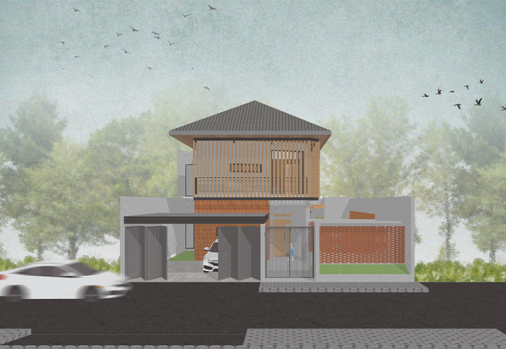 The perspective is designed to create a cloudy, soft-toned atmosphere to avoid overly striking visuals. The muted color palette helps maintain a calm and balanced composition. A single car is placed in front of the house as a subtle representation of activity, without overcrowding the scene. This approach ensures that the main focus remains on the house itself, highlighting its design and spatial character.