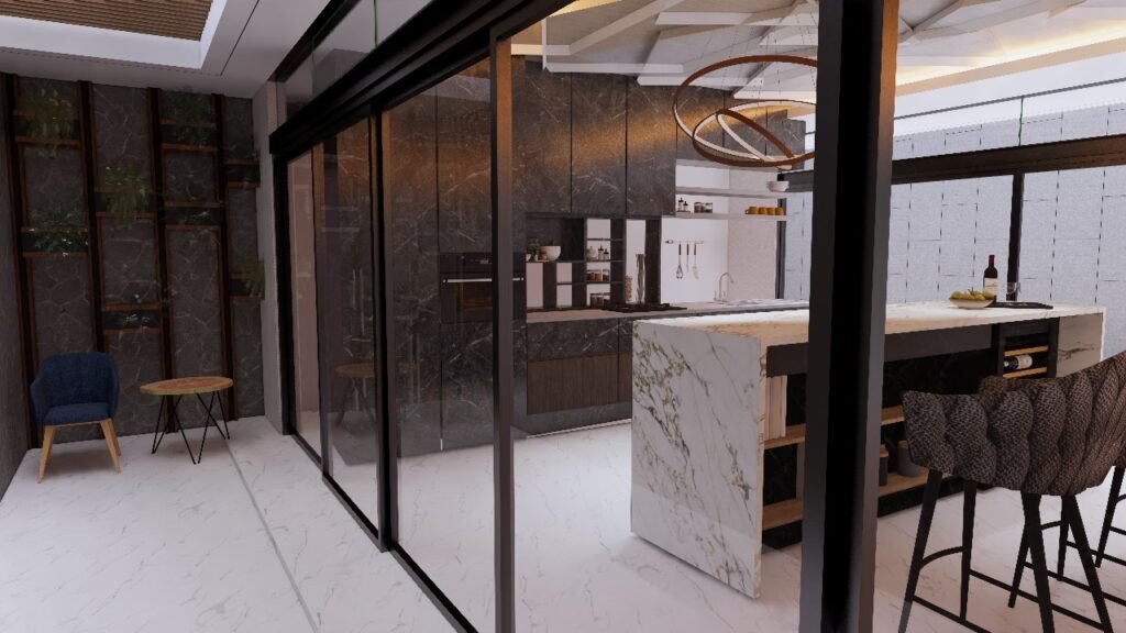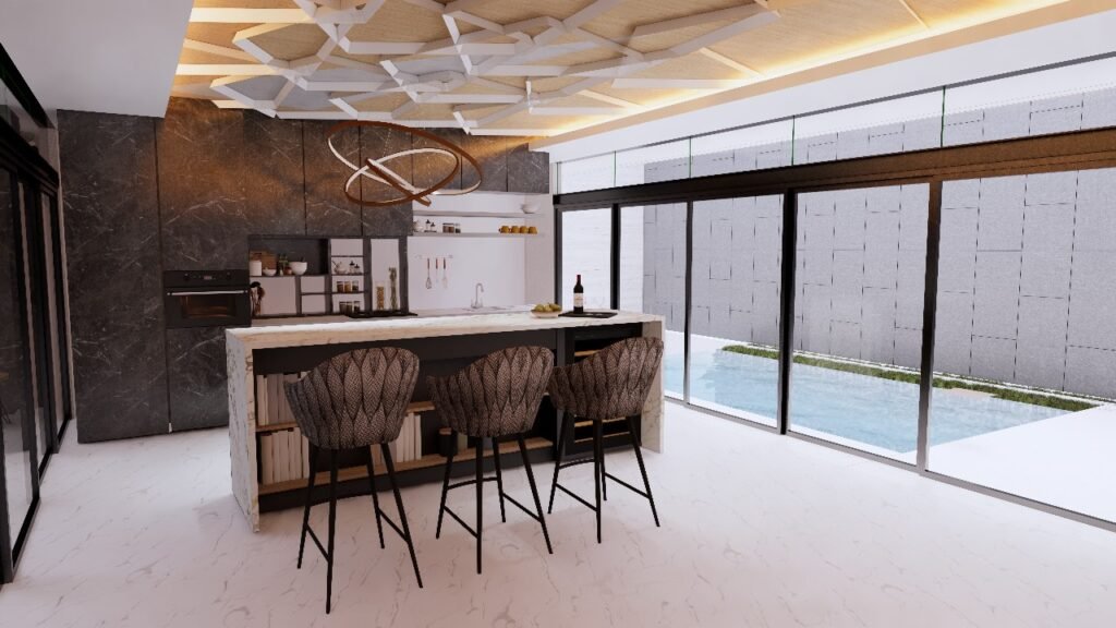 Ruang Kitchen & kitchen island with a Modern American theme, the room looks luxurious and comfortable with touches of marble & granite and the colors white, grey, black.