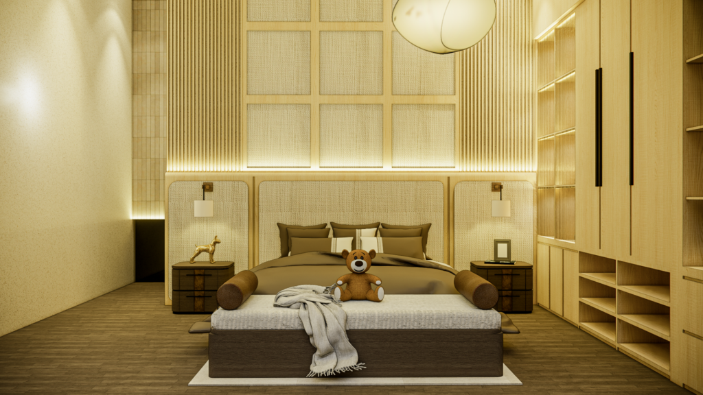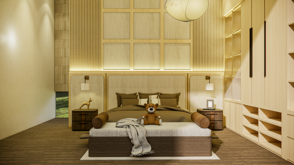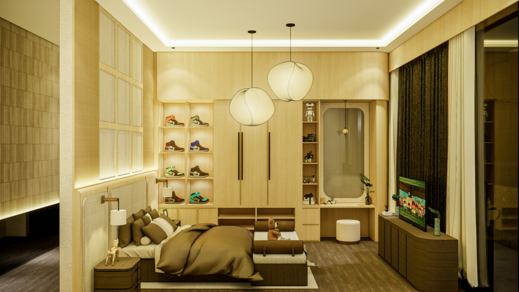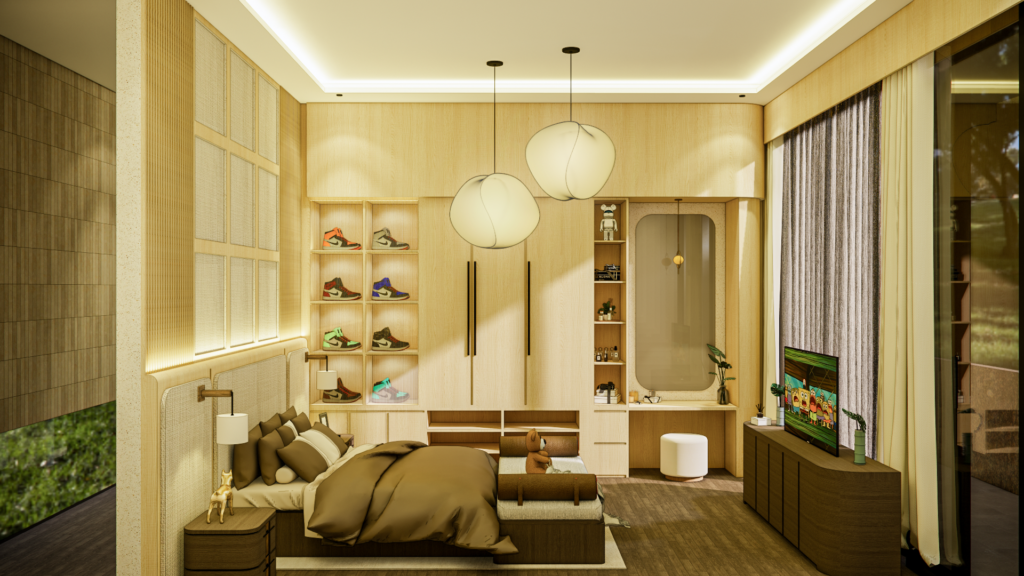 Konsep dari perancangan rumah tinggal ini adalah “you are where you live”. Ruangan pada gambar merupakan kamar tidur yang dirancang dengan gaya modern dan elegan, dengan nuansa hangat dan natural. Keseluruhan ruangan mencerminkan desain kontemporer yang nyaman, stylish, dan fungsional, cocok untuk anak remaja atau dewasa muda dengan minat pada sneakers, mainan koleksi, dan hiburan. Berikut deskripsi berdasarkan elemen interiornya: