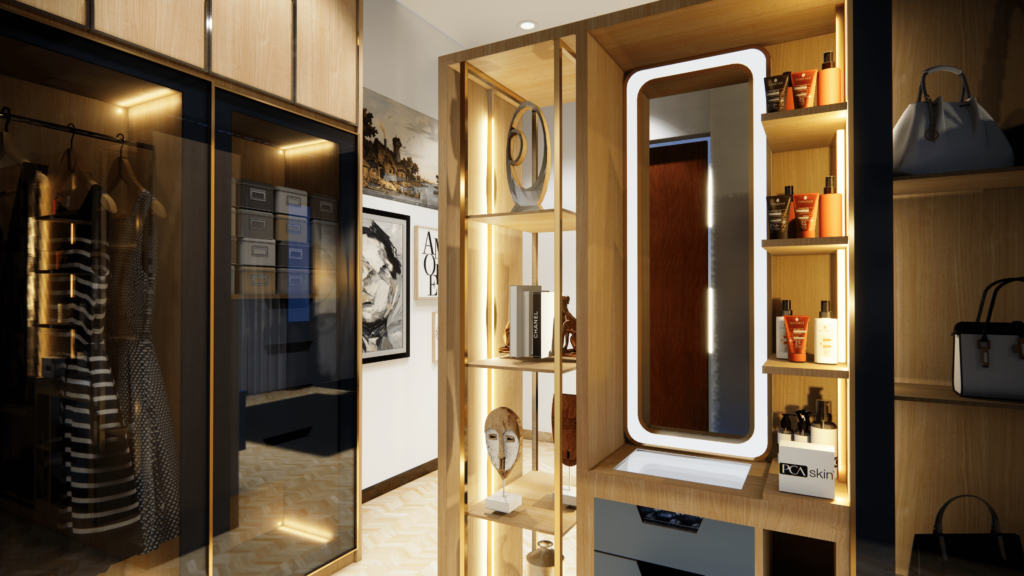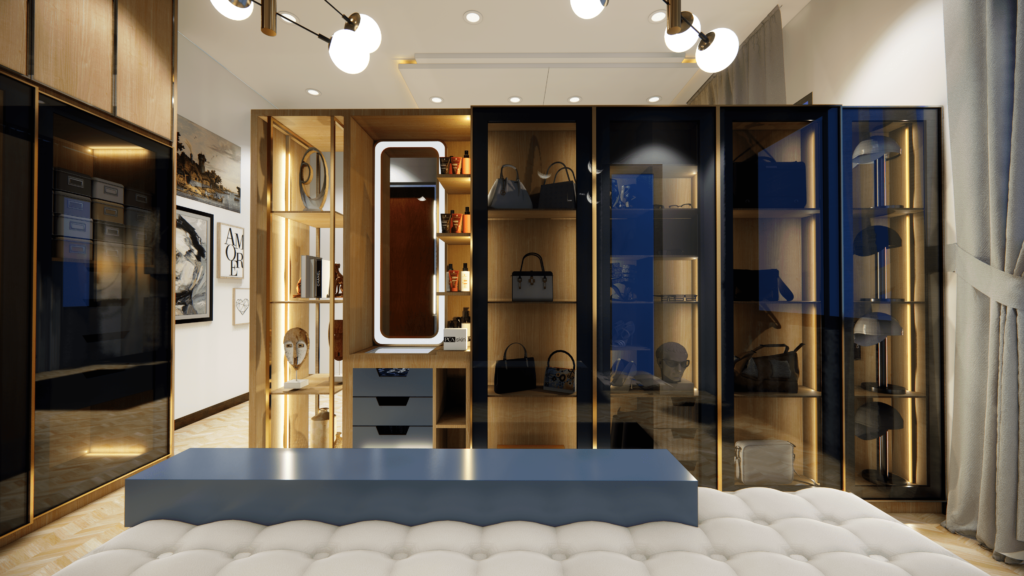 Desain Interior kamar tidur ini menggunakan penggayaan Modern Luxury. Konsep warna biru menjadikan focal point pada ruang dan pengaplikasian warna emas yang dipadukan material kayu memberikan kesan ruang yang mewah dan modern.