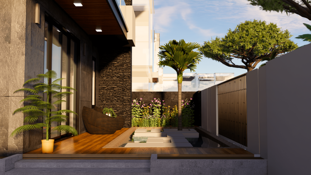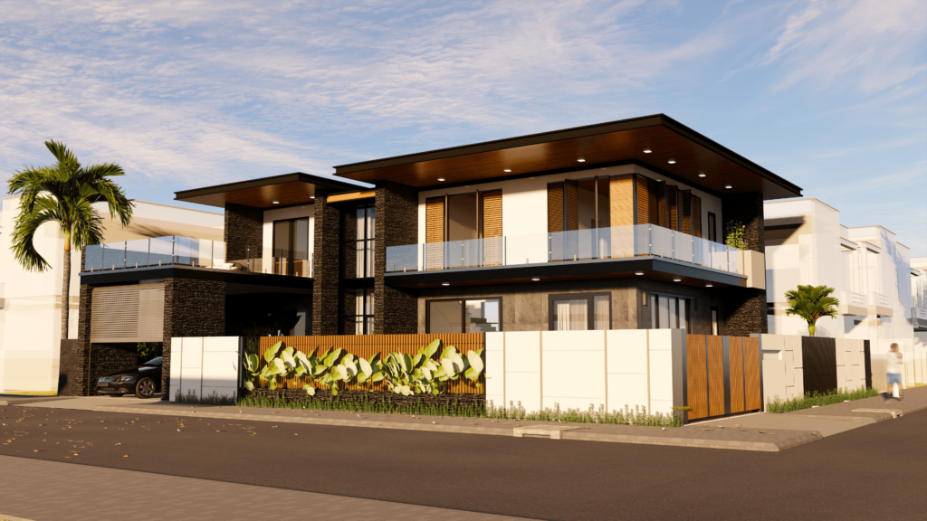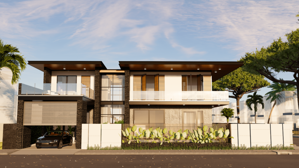 Desain exterior bangunan rumah 2 lantai dengan pemilihan waktu render pada sore hari menciptakan suasana ketenangan pada lingkungan sekitar bangunan