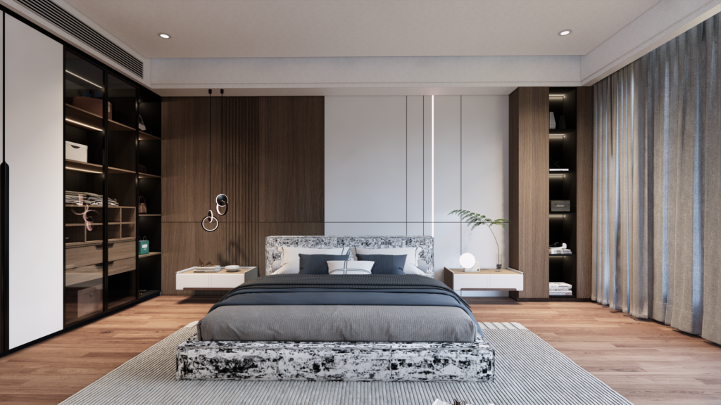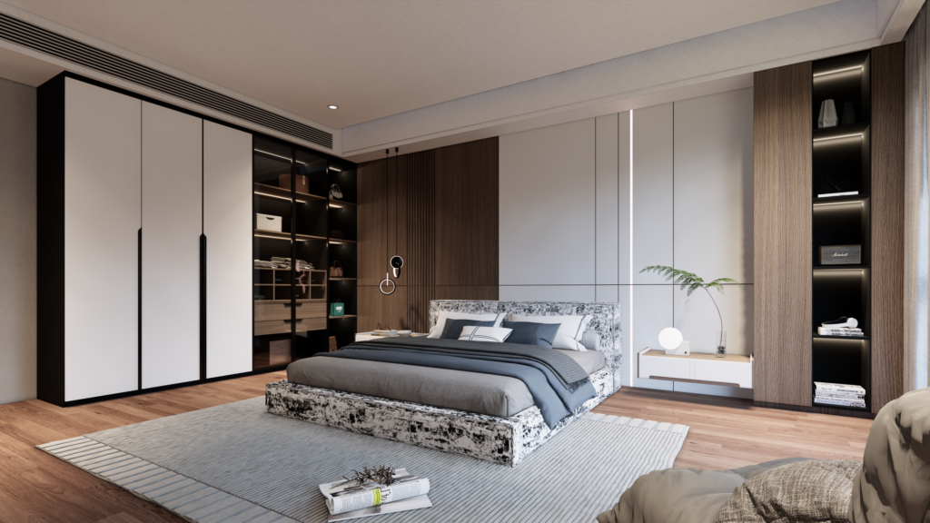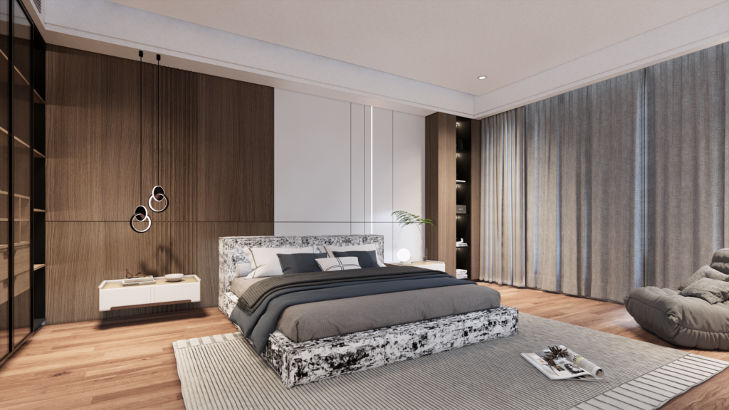 Desain interior minimalis yang menawan dengan dominasi warna putih dan elemen kayu. Ruang terbuka yang memanfaatkan cahaya alami untuk menciptakan kesan terang dan luas. Furnitur minimalis dan aksen kayu pada dinding dan lantai menambahkan sentuhan hangat dan keanggunan pada ruangan. Desain ini menggabungkan fungsionalitas modern dengan estetika alami, menciptakan suasana yang tenang dan menyenangkan.