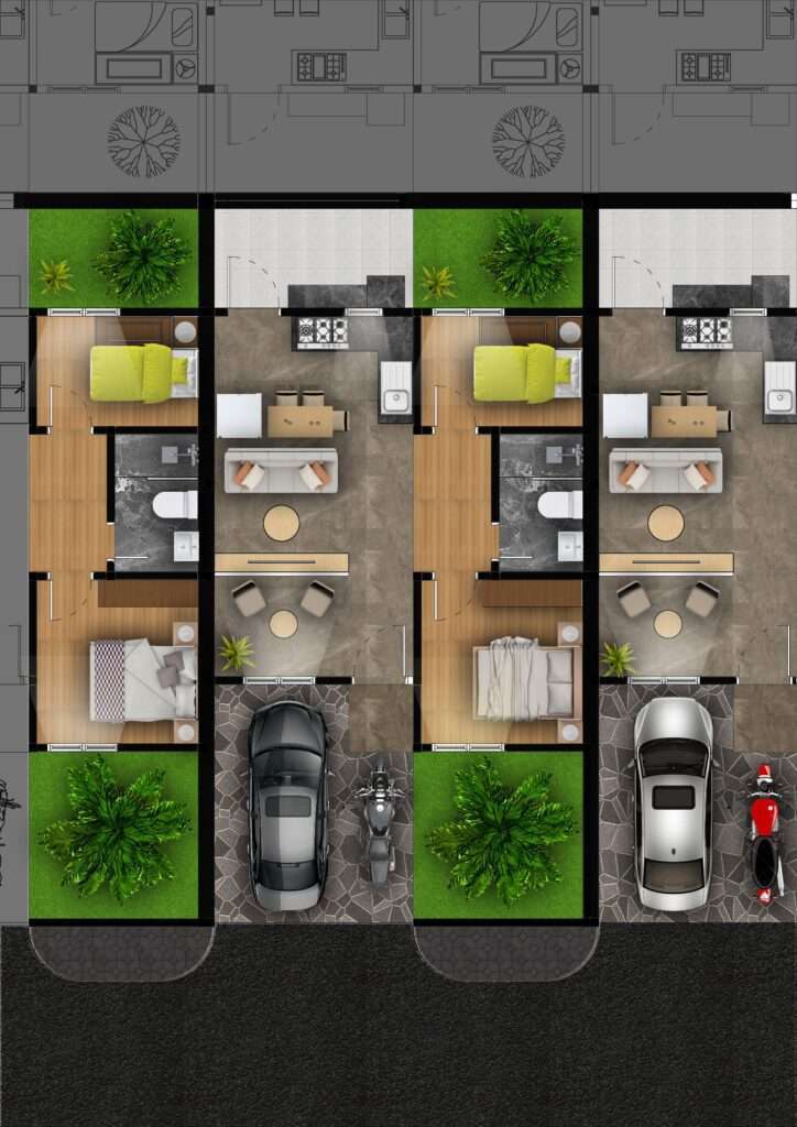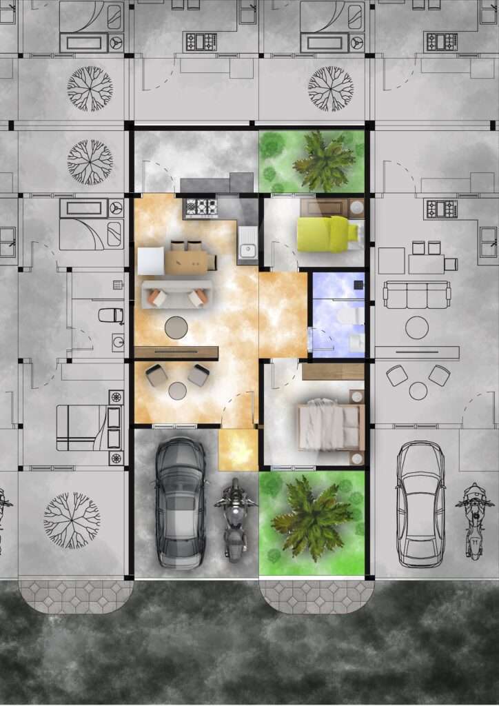 Rendering denah rumah dengan menggunakan Texture Style dan Watercolor Style untuk mendukung visualisasi presentasi keapad klien.