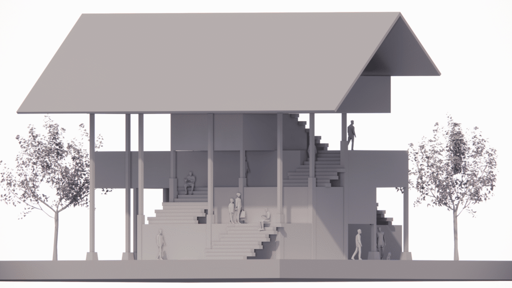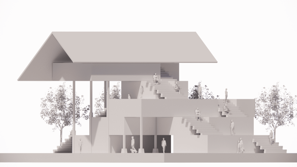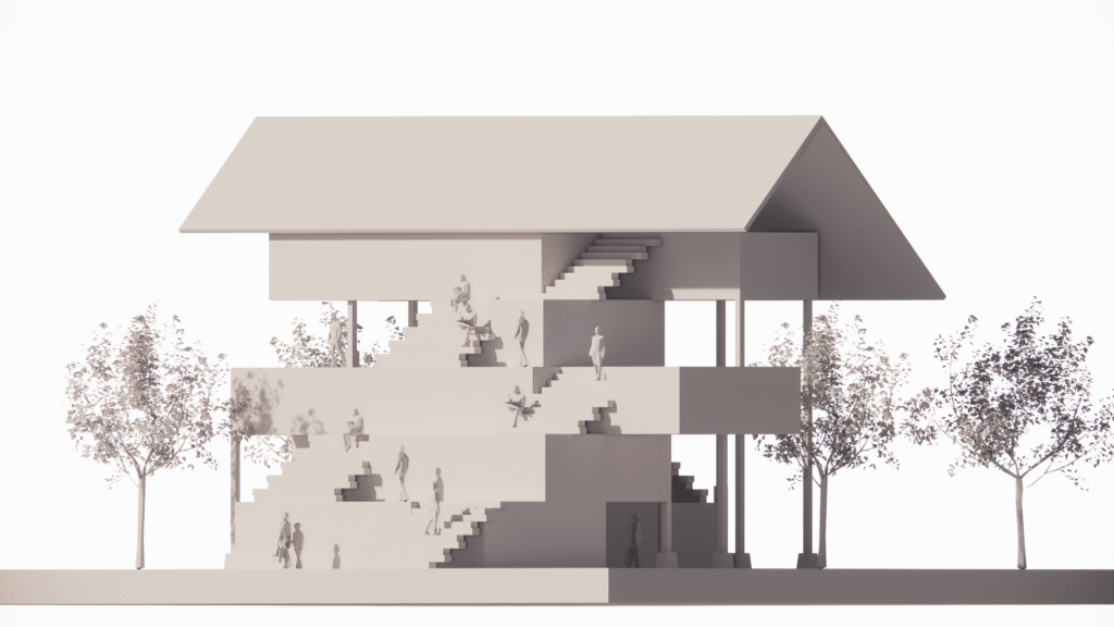 Permainan Elevasi sebagai Ruang Komunal (Stairscape): Elemen paling menonjol pada gambar kedua adalah penggunaan tangga-tangga lebar yang berfungsi ganda. Selain sebagai jalur sirkulasi vertikal, tangga ini dirancang sebagai tempat duduk santai (tribun) bagi publik. Ini menciptakan ruang baca terbuka yang dinamis, di mana pengunjung dapat duduk di berbagai level ketinggian untuk membaca atau bersosialisasi.