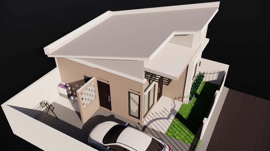 Konsep minimalis dan minim perawatan di aplikasikan dalam desain rumah ini, dengan atap bentuknya sederhana. ruangannya berisi 1 ruang tamu, 1 ruang keluarga, 1 kamar mandi, dan sepasang kamar tidur. serta dibelakangnya ada area service dan area dapur sederhana.