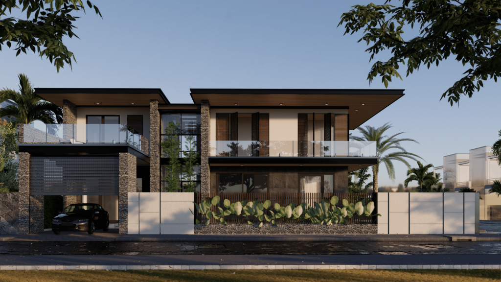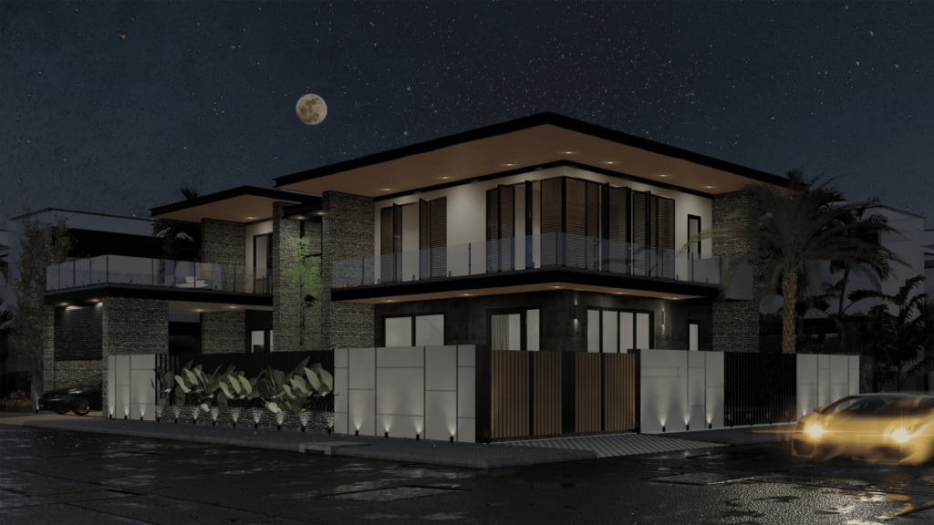 Rumah hunian ini mengusung konsep industrial modern yang mengedepankan tampilan sederhana namun tetap estetik. Desain fasad didominasi oleh material seperti beton ekspos, baja, dan kayu untuk menciptakan suasana yang urban dan maskulin.