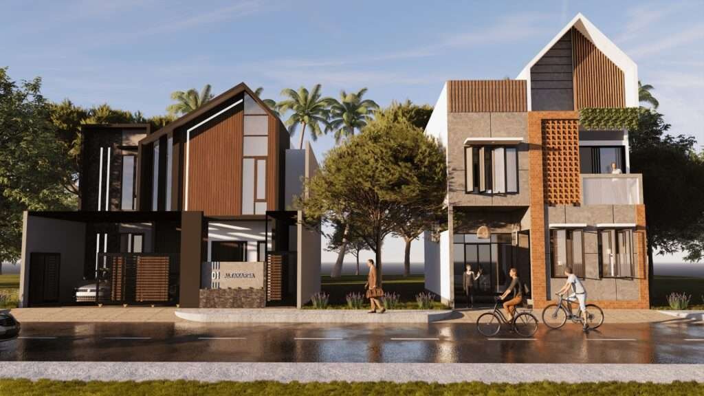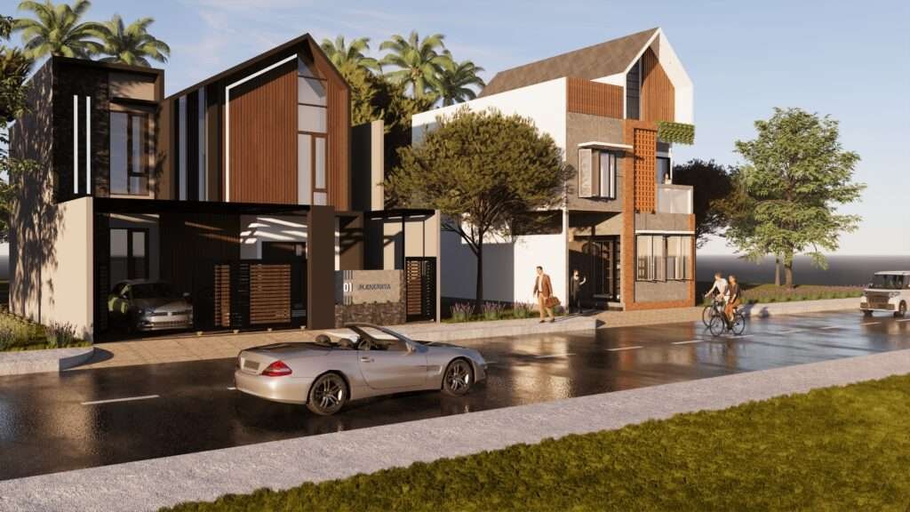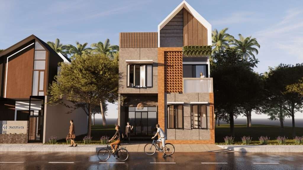 Desain rumah minimalis dengan penggunaan atap yang tinggi serta miring membawakan konsep tropis, kombinasi material exterior seperti kayu, concrete, batu bata, dll agar dapat menambah kestetikaan pada bangunan tanpa mengurangi fungsi nya.