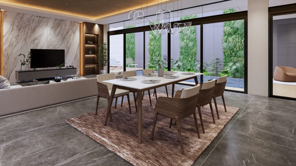 Hasil render Interior (Living, Dining, Kitchen) pada tugas kelas Interior Modelling & Visualization Batch 2. Rendering menggunakan Enscape dan post-editing menggunakan Photoshop.