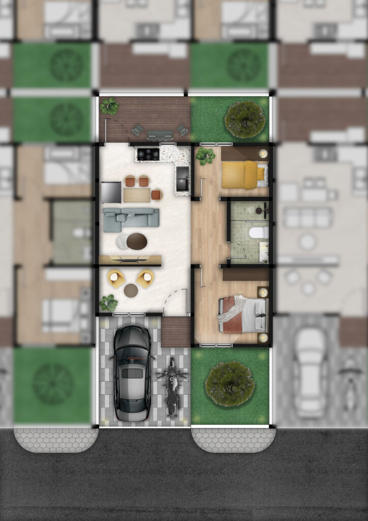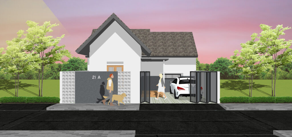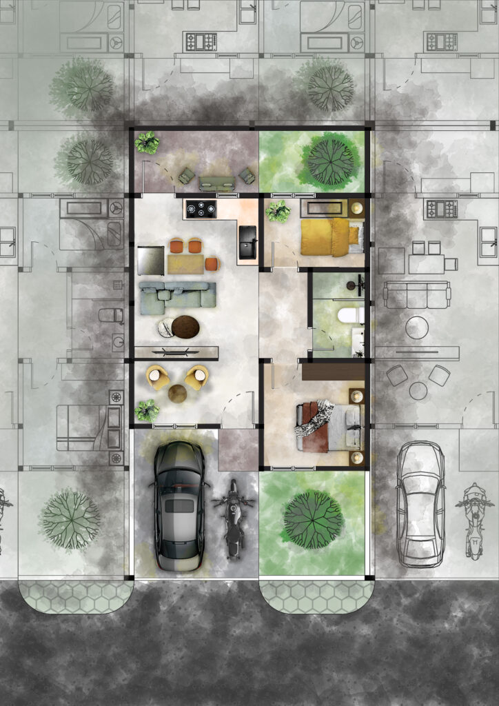 Presentasi 2D Render dari desain interior dengan gaya kontemporer, yang berfokus pada intimacy yang dapat tercipta dalam rumah tersebut dengan meningkatkan spirit dan emosi para penghuninya.